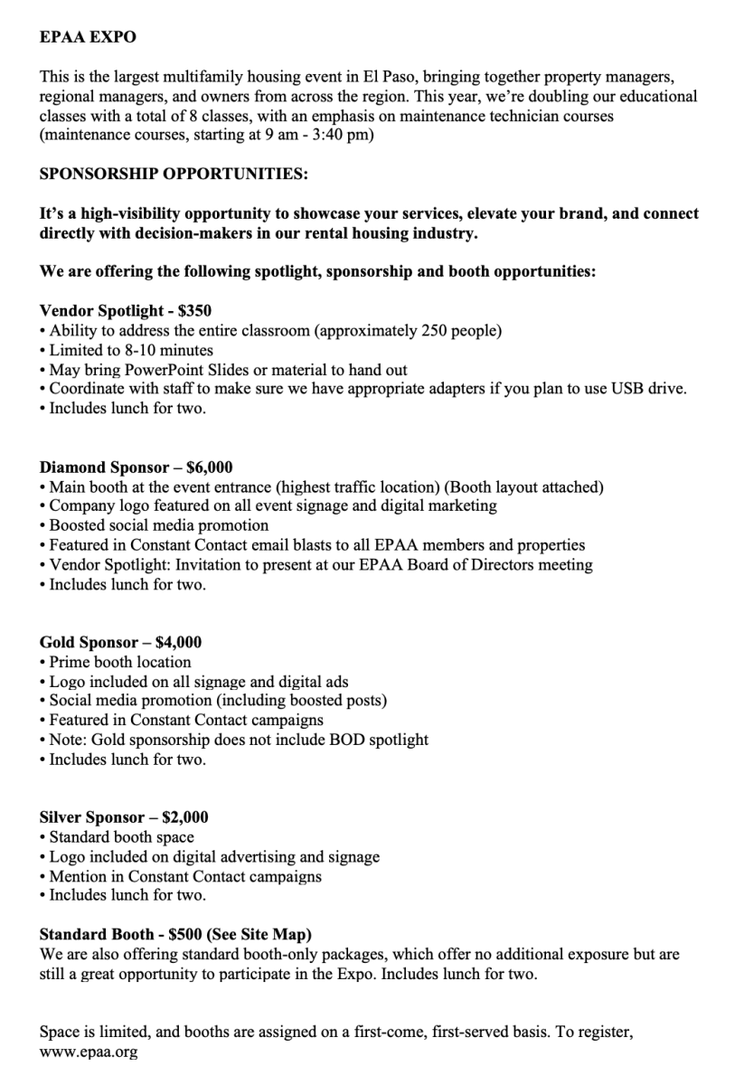 It’s a high-visibility opportunity to showcase your services, elevate your brand, and connect directly with decision-makers in our rental housing industry.