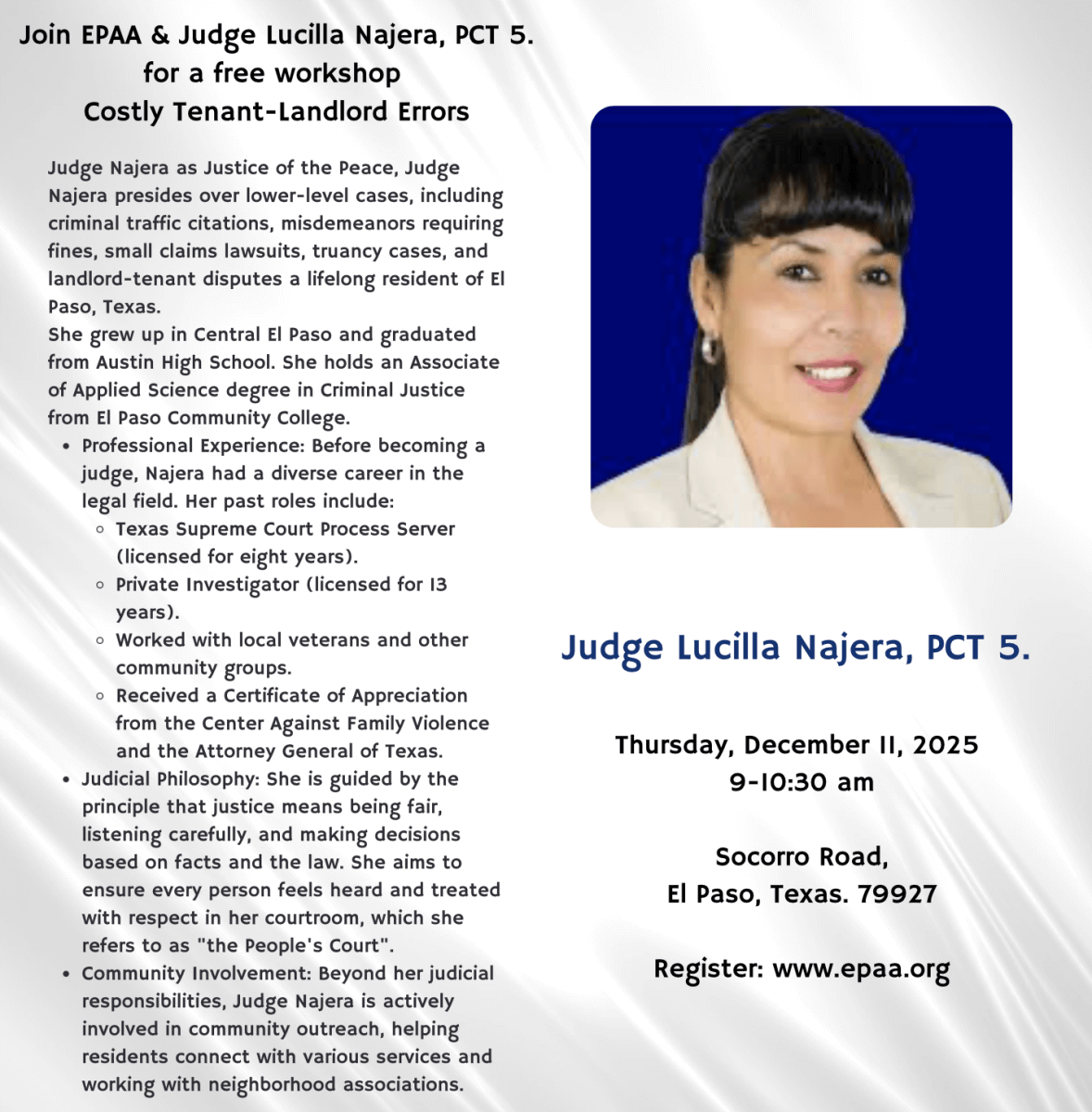 Join EPAA & Judge Lucilla Najera, PCT 5, for an in-person 1 1/2 workshop and discussion in her courtroom on 12/11, from 9am-10:30. This workshop and discussion will help you understand Landlord Tenant costly mistakes and how she applies the law in PCT. 5